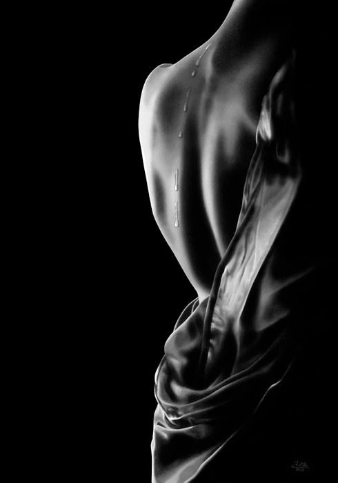Cette pièce de triptyque se concentre sur la sensualité subtile d'un dos féminin, drapé dans un tissu soyeux. Ici, l'artiste s'attarde sur les détails, capturant chaque goutte de lumière qui glisse le long de la peau, chaque pli du tissu qui épouse les formes du corps. Cette œuvre incarne la délicatesse et la puissance de la féminité, suggérant une histoire silencieuse de désir, de vulnérabilité et de force. Le contraste entre les ombres profondes et les lueurs de lumière accentue la profondeur émotionnelle, invitant le spectateur à une contemplation méditative.